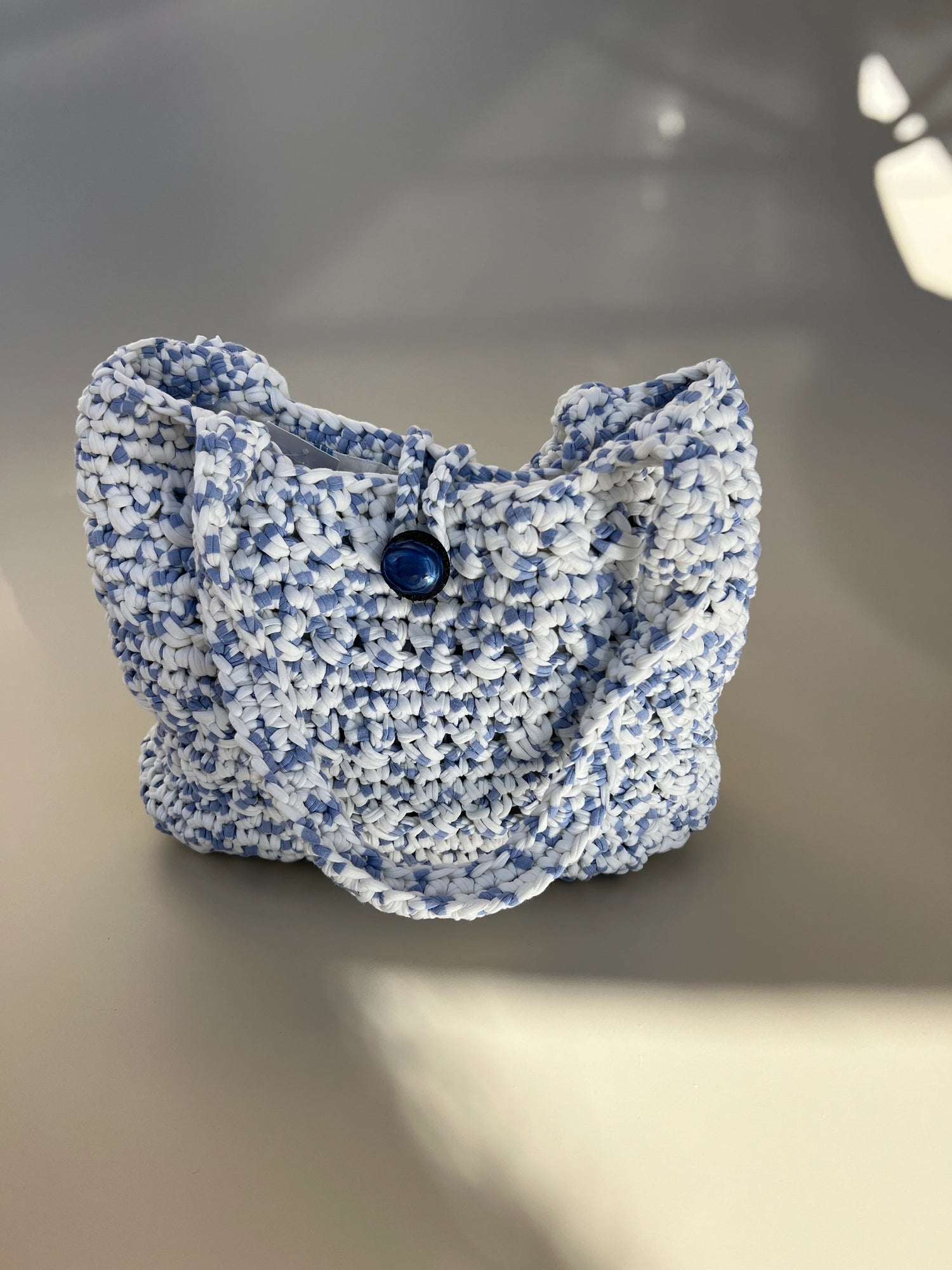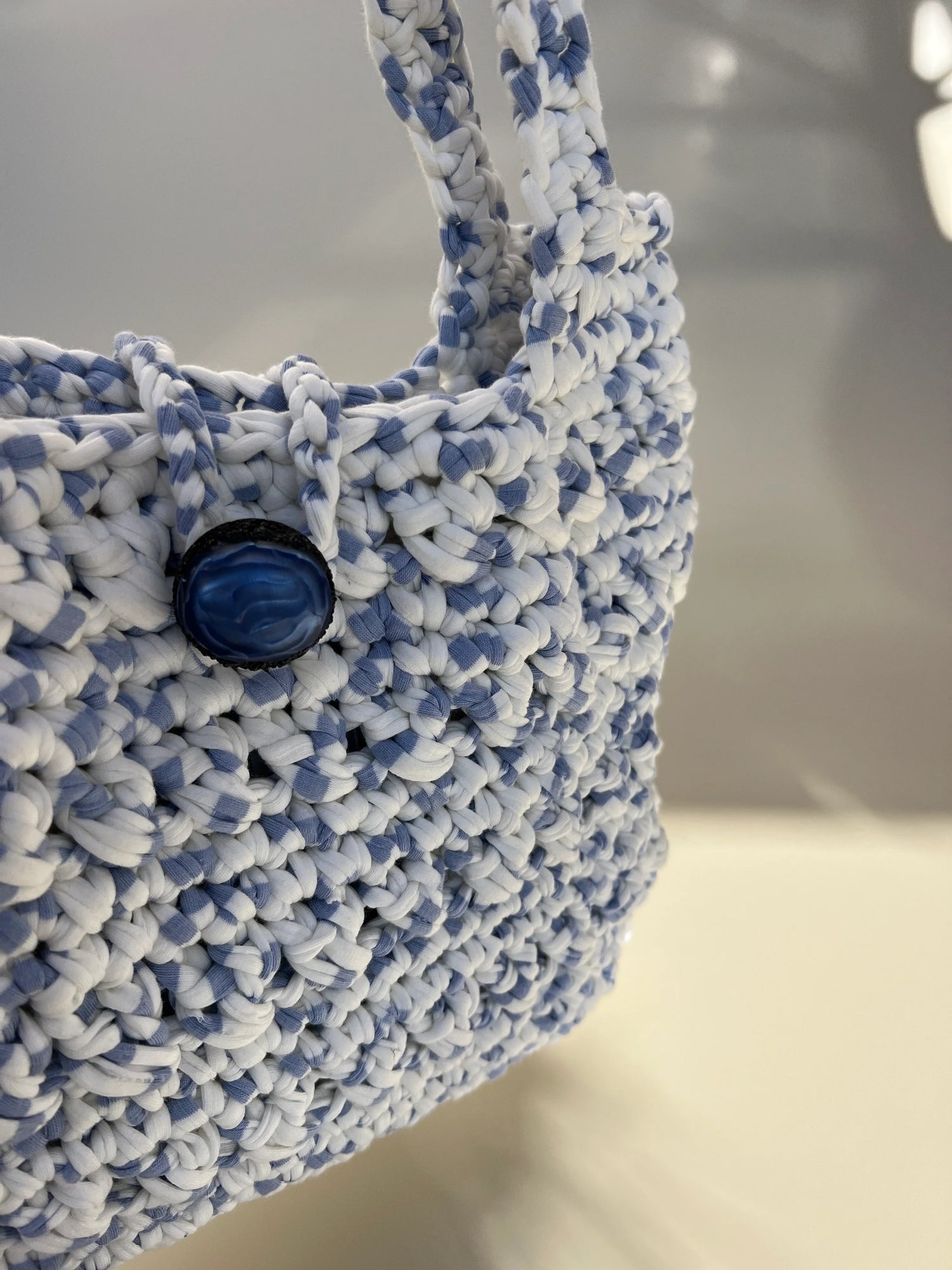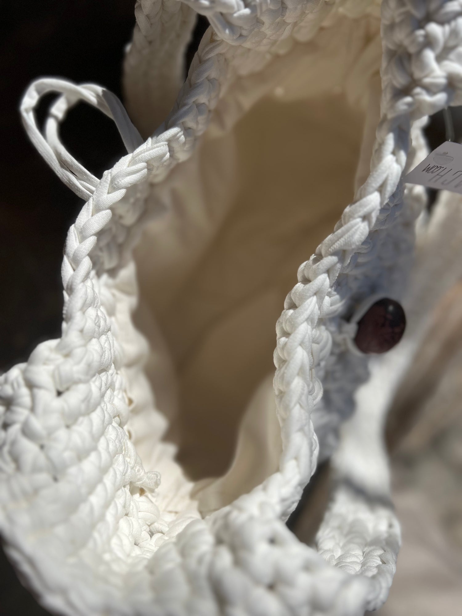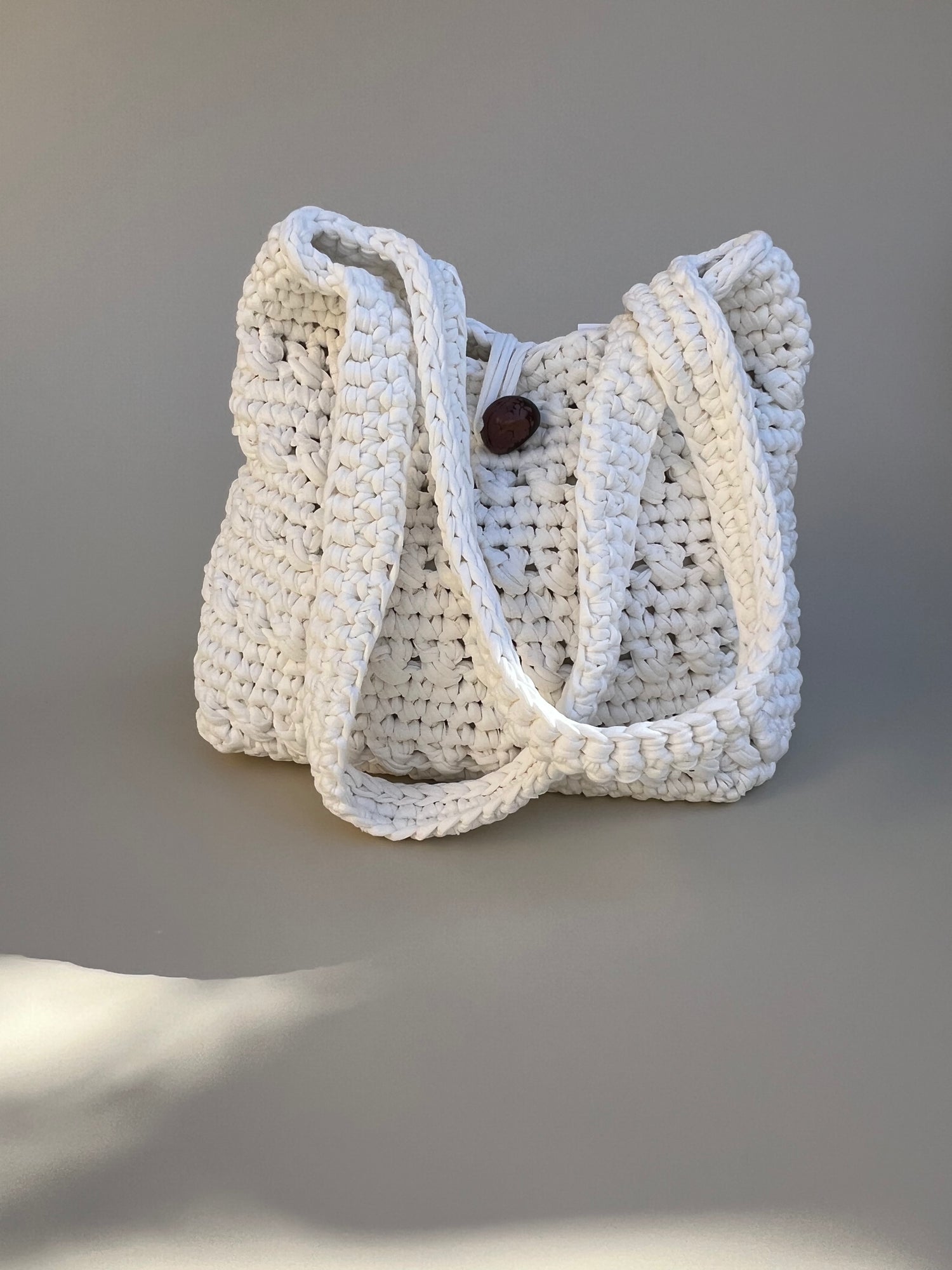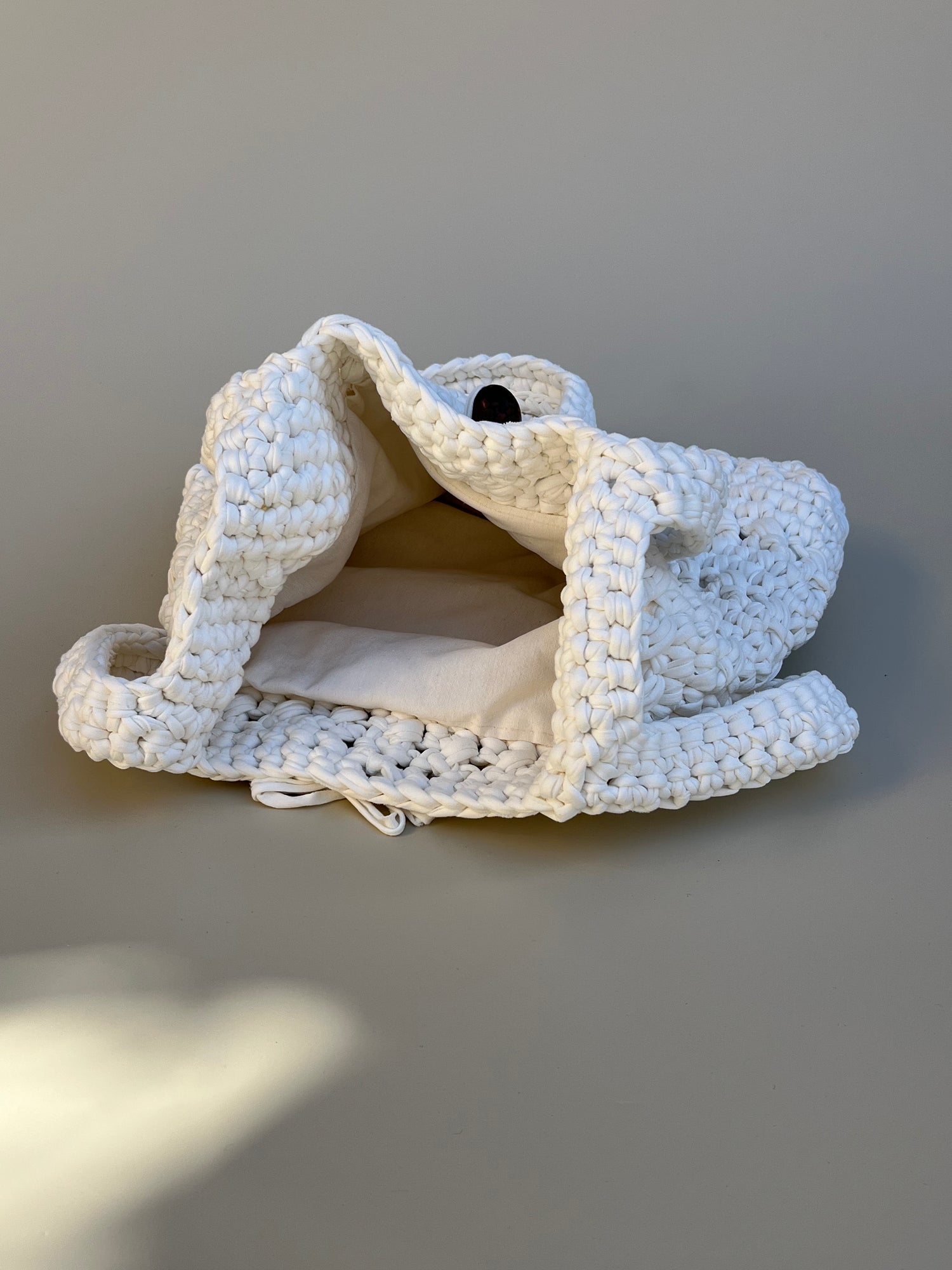 This bag is handmade in crochet, with an interior lining and long handles that allow you to keep your hands free while carrying things. Its beige color and elegant design will accompany you in all your activities.