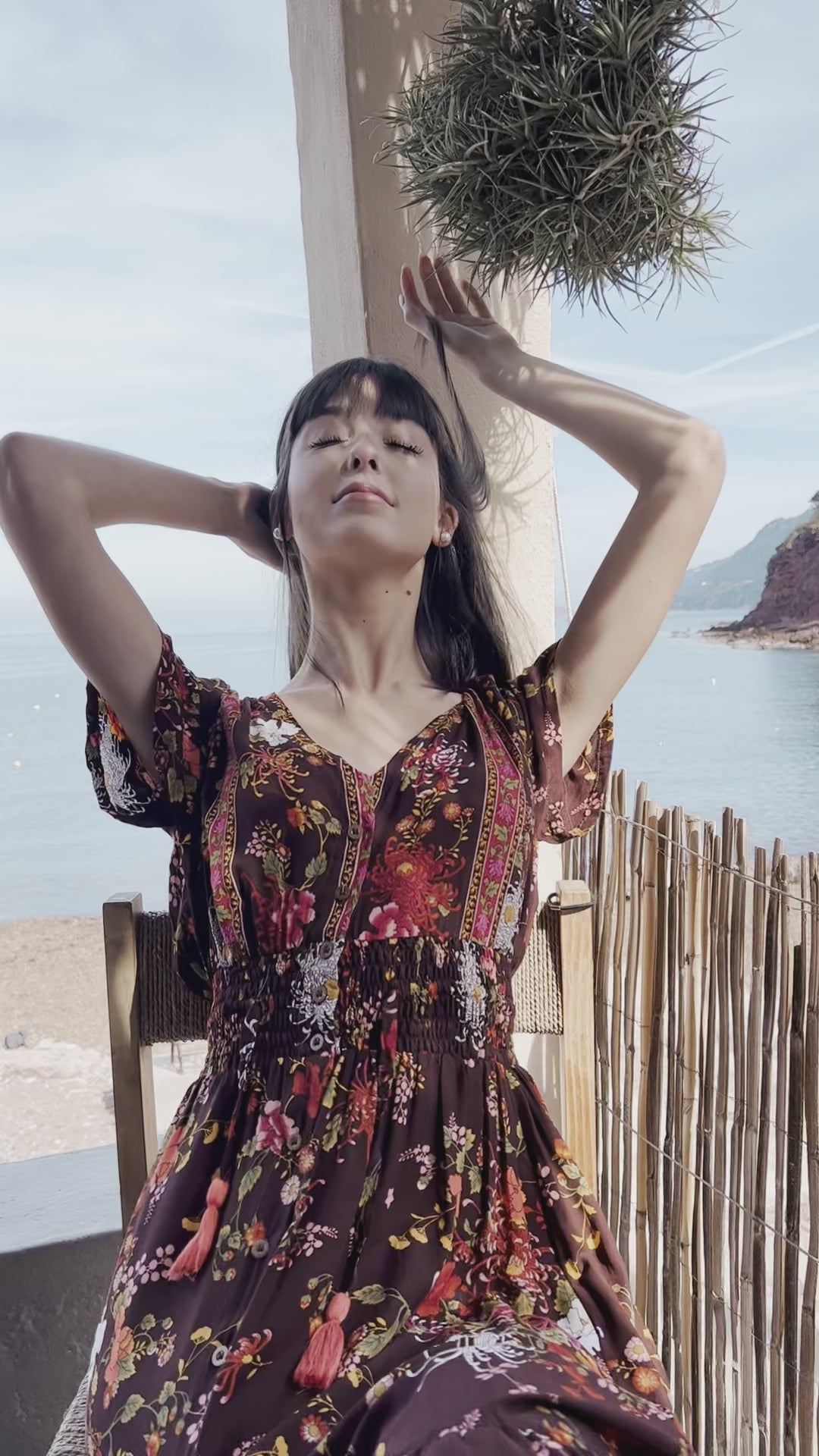 Its flowers combined on an earthy background, give it vitality and elegance. With a final touch of coral pompoms, to match its flowery tones and a matching adjustable belt sewn around the waist.