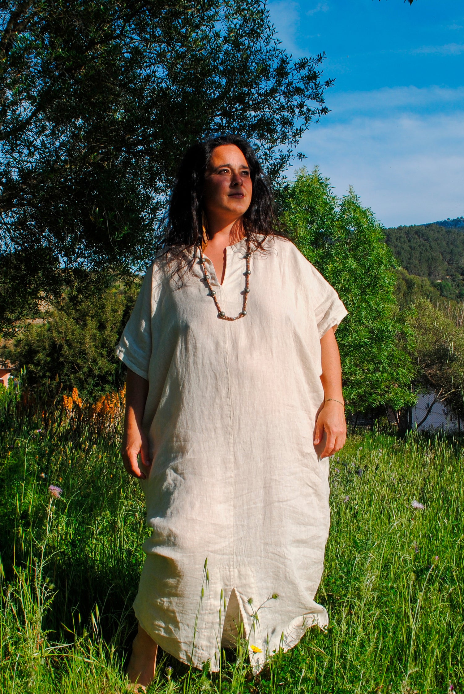 Kaftan lino 100%. Tela suave y caída. Cuello pico. Vestido con apertura anterior. Mangas media mariposa.