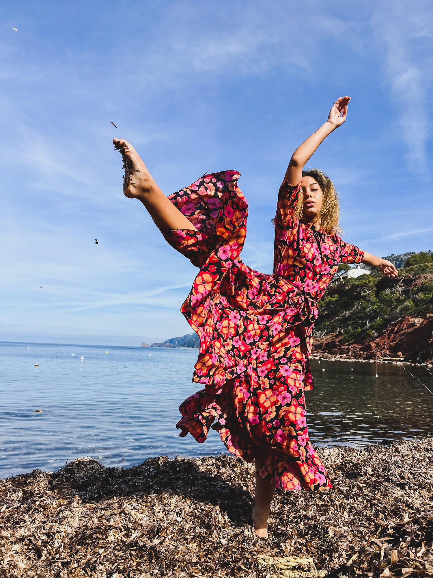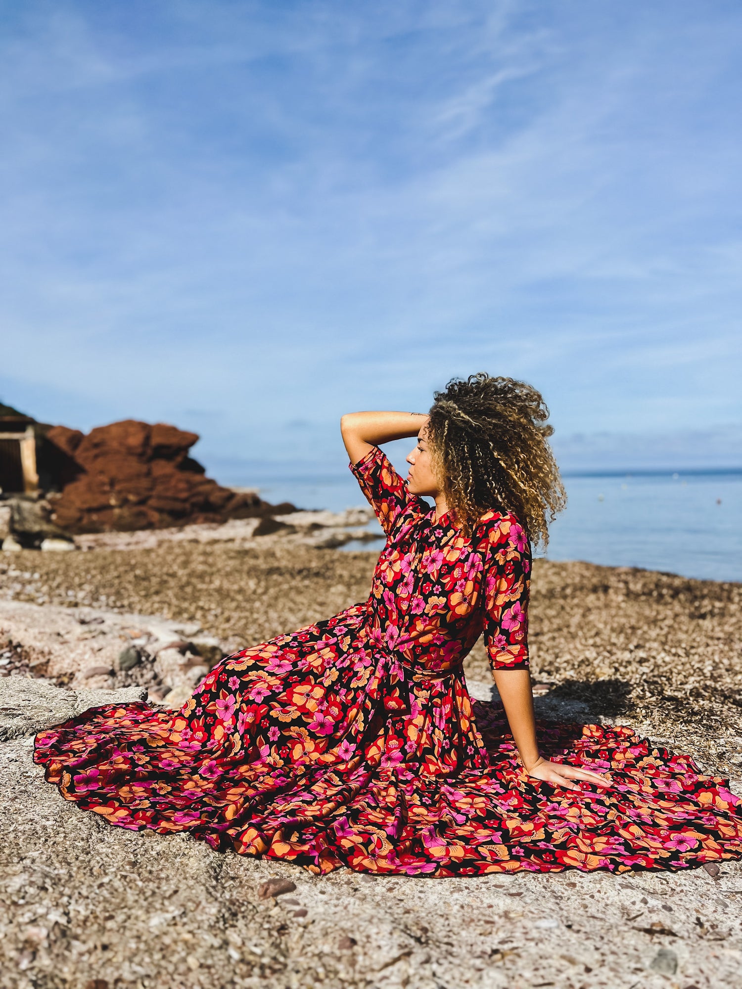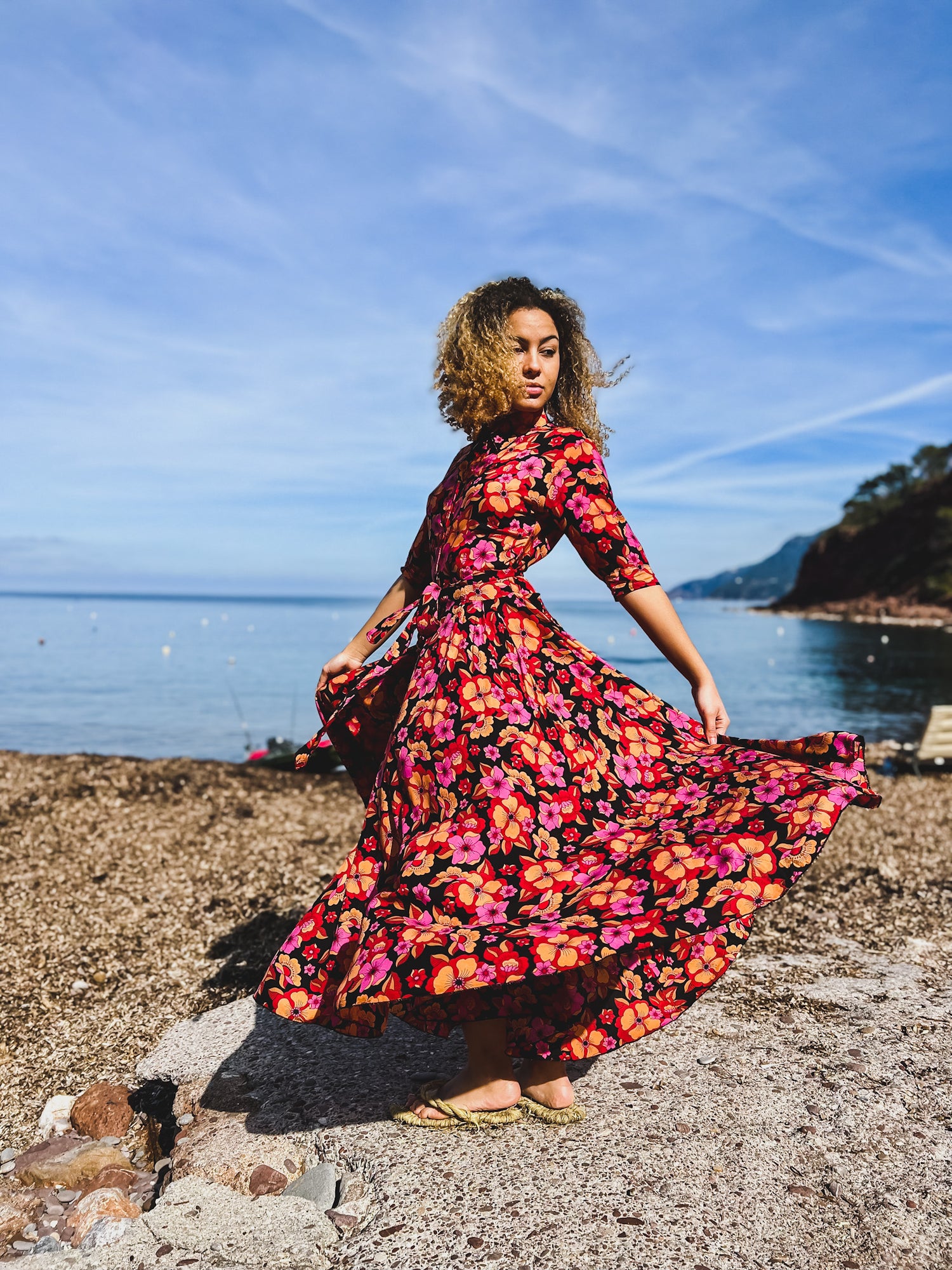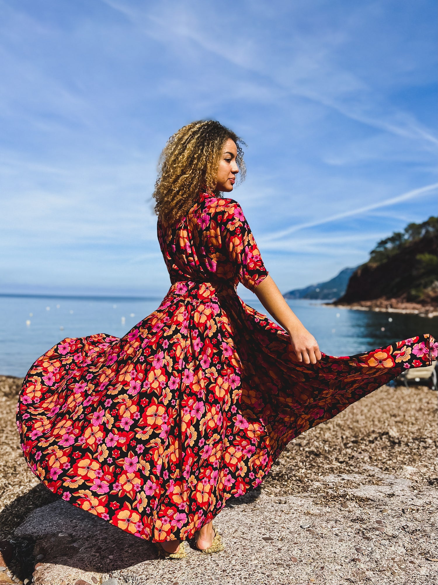 Vestido camisero con solapas de camisa, en fondo negro, con estampado floreado combinando colores de tendencia.
